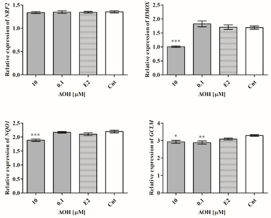Next, the expression of Nrf2 signaling pathway was evaluated, as a main responsive element to oxidative stress in cells. Although the expression of NRF2 was almost not changed (Figure 3), the expression of heme oxygenase 1 (HMOX1), NADPH quinone dehydrogenase 1 (NQO1), and GCLM was significantly decreased after treatment with 10 µM of AOH (*** p < 0.001, *** p < 0.001, * p < 0.05), and 0.1 µM of AOH in the case of glutamate-cysteine ligase regulatory subunit (GCLM) gene (** p < 0.01), as compared to control.