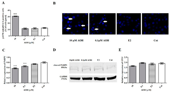 The induction of oxidative stress in cells might be associated with DNA damage [21]. To evaluate if AOH might induce oxidative stress in mammary gland epithelial cells, the cells expressing phospho-ataxia telangiectasia mutated kinase (p-ATM) and phospho-histone H2A.X (pH2A.X) were stained and counted with flow cytometry. We observed that AOH in the dose of 10 µM significantly increased DNA damage in cells (*** p < 0.001) as compared to control cells (Figure 4A), whereas the lower dose of AOH caused almost no effect. We observed a changed morphology of nuclei: not uniformly stained with 2-(4-Amidinophenyl)-6-indolecarbamidine dihydrochloride (DAPI), not round-shaped in both doses of AOH, confirming previous results (Figure 4B). However, the changes in nuclei staining were also observed for lower dose of AOH and were not confirmed by flow cytometry. Moreover, we observed that AOH in a dose-dependent manner significantly reduces expression of poly(ADP-ribose) polymerase (PARP1), a first responder in cells to DNA damage, as compared to control (*** p < 0.001) (Figure 4C). On the protein level, the decrease in the expression of PARP1 was detectable only for higher concentration of AOH (Figure 4D). We also observed a decreased expression of a regulator of DNA repair- transformation related protein P53 (TP53) after treatment with 10 µM of AOH (Figure 4E); however, no significant changes were observed.