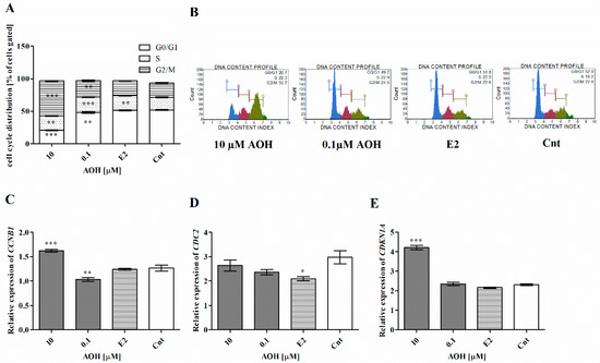 AOH modulates cell cycle progression in 184A1 cells. (A) Cell cycle progression after AOH treatment counted with Muse Cell Cycle Kit. (B) Representative results of the flow cytometry. (C–E) The relative expression of CCNB1, CDC2, and CDKN1A obtained in RTqPCR. The results are presented as mean ± SE. One-way ANOVA was used to calculate statistically significance. P lower than 0.05 was considered as statistically significant. * p < 0.05, ** p < 0.01, *** p < 0.001 as compared to control. AOH–alternariol, E2–10 nM estradiol, Cnt–control, CCNB1–cyclin B1, CDC2–cyclin-dependent kinase 1, CDKN1A–cyclin-dependent kinase inhibitor 1 (p21).