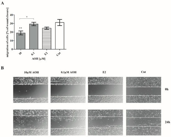 Cells motility is observed both during physiological and pathological processes, especially in carcinogenesis. It is associated with cells migration, invasion, adhesion, and interaction with extracellular matrix proteins (ECM). Especially, in the case of the mammary gland, reorganization of its structure plays a crucial role. Thus, we decided to evaluate if and how AOH affects cells motility. Firstly, we observed that AOH affect cells migration (Figure 6A,B). After 24 h treatment with AOH in a dose of 10 µM, a statistically significant decrease in the cells migration was observed, as compared to control cells (** p < 0.01). A similar effect, but in a lower extend, was observed for AOH in a dose of 0.1 µM (* p < 0.01).