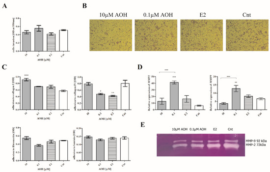 Next, the invasion and adhesion of cells, as well as the activity of metalloproteinases, was evaluated. We observed that AOH only slightly modulated the invasion of cells, and these changes were not significant (Figure 7A,B), whereas the adhesion of 184A1 cells was significantly modulated by AOH. We observed that 10 µM of AOH significantly increased the adhesion of cells to collagen I (*** p < 0.001) and not significantly in the case of collagen IV, laminin, and fibronectin (Figure 7C). Interestingly, the adhesion to ECM proteins was significantly decreased after treatment of cells with 0.1 µM AOH, similarly to estrogen (E2) treatment (collagen IV, * p < 0.05 and ** p < 0.01, respectively). The changes in cells migration and adhesion after high-dose AOH treatment were associated with the decrease in the expression and activity of metalloproteinase 2 (MMP-2) and 9 (MMP-9) evaluated with RTqPCR and zymography assay (Figure 7D,E). A contradictory effect was observed for lower dose of AOH: a statistically significant increase in the MMP-2 and MMP-9 expression was observed (*** p < 0.001, ** p < 0.01).