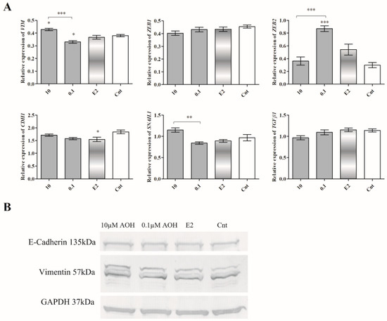 The expression of EMT regulators. (A) The results of RTqPCR are expressed as mean ± SE. One-way ANOVA was used to calculate the statistical significance, p < 0.05 was established as significant. * p < 0.05, ** p < 0.01, *** p < 0.001 as compared to control. (B) The representative results of Western blot. AOH–alternariol, E2–10 nM estradiol, Cnt–control, CDH1–E-cadherin, VIM–vimentin, ZEB1–Zinc finger E-box-binding homeobox 1, ZEB2–Zinc finger E-box-binding homeobox 2, SNAIL1–Zinc finger protein SNAI1.