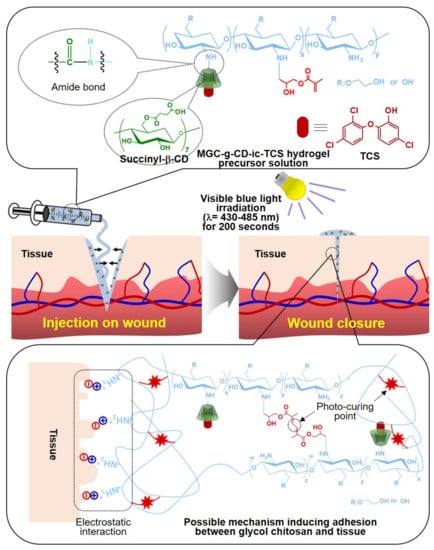 Schematic illustration on the application of β-cyclodextrin/triclosan complex-grafted methacrylated glycol chitosan (MGC-g-CD-ic-TCS) as a tissue bio-adhesive and possible mechanism of adhesion between MGC-g-CD-ic-TCS and soft tissue.