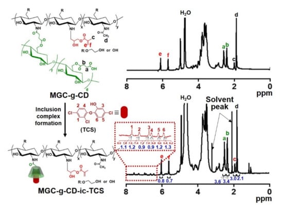 1H NMR spectra of MGC-g-CD and MGC-g-CD-ic-TCS analyzed using D2O. a and b—CH2CH2- peak of succinyl β-CD; c, e, and f-methyl and vinyl groups of glycidyl methacrylate; d-methyl group of glycol chitosan. The numbers from 1 to 6 in the dotted line indicated triclosan.