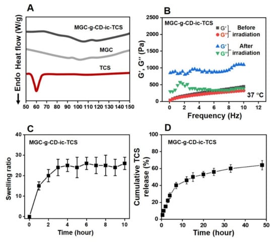 (A) DSC curves of triclosan (TCS), methacrylated glycol chitosan (MGC), and MGC-g-CD-ic-TCS monitored from 50 °C to 150 °C, (B) storage/loss moduli of MGC-g-CD-ic-TCS hydrogel precursor solution measured from 0 Hz to 10 Hz before and after visible light irradiation for 200 s, (C) swelling ratio of MGC-g-CD-ic-TCS measured at determined time intervals (0, 1, 2, 3, 4, 5, 6, 7, 8, 9, and 10 h), (D) Cumulative TCS release percentage calculated at determined time intervals (0.5, 1, 2, 3, 4, 7, 12, 15, 20, 25, 33, and 48 h). Swelling ratio and release behavior tests were performed in triplicate (n = 3).