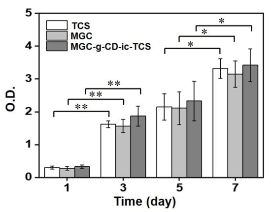 In vitro cell proliferation of L-929 cells cultured on TCS, MGC, and MGC-g-CD-ic-TCS for 1, 3, 5, and 7 days. This test was performed in triplicate (n = 3; * p < 0.05, ** p < 0.01).