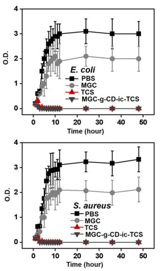 Escherichia coli ATCC25922 (E. coli) and Staphylococcus aureus ATCC6538 (S. aureus) were used for evaluating the antibacterial activity of MGC and MGC-g-CD-ic-TCS (TCS: 1.8 µg) hydrogels. It was estimated by monitoring the optical density of the two bacteria at 600 nm. E. coli or S. aureus (10 µL mid-long phase; O.D. = 0.3 units) were inoculated in fresh nutrient LB broth medium containing the two hydrogels (60 mg/L per each hydrogel) in flasks. LB medium alone was used as a negative control. Afterward, the flasks were incubated at 37 °C with a continuous stirring at 150 rpm. The optical density was measured for 48 h at 1-h intervals.