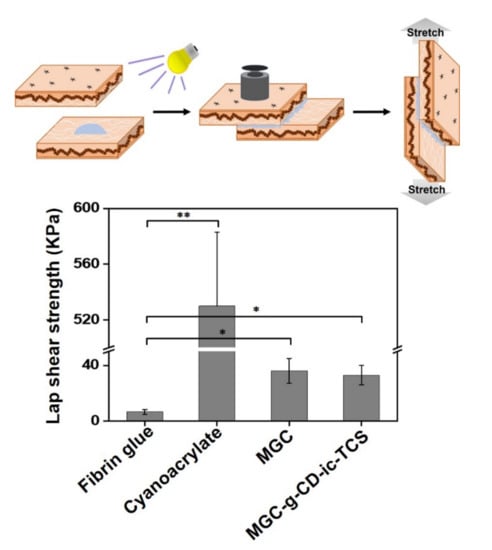 Lap shear strength of fibrin glue, cyanoacrylate, MGC, and MGC-g-CD-TCS. This test was performed in triplicate (n = 3; * p < 0.05, ** p < 0.01).
