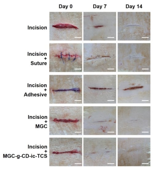 Gross appearances of untreated incision, and incisions treated with suture (incision + suture), cyanoacrylate (incision + adhesive), MGC (incision + MGC), and MGC-g-CD-ic-TCS (incision + MGC-g-CD-ic-TCS). The incisions were observed at day 0, 7, and 14. The white scale bars indicate 1 cm.