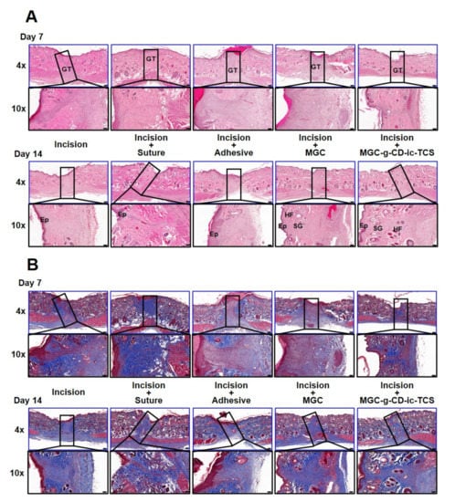 (A) H&E-stained and (B) MT-stained images of untreated incision, and incisions treated with suture (incision + suture), cyanoacrylate (incision + adhesive), MGC (incision + MGC) and MGC-g-CD-ic-TCS (incision + MGC-g-CD-ic-TCS) after 7 and 14 days. The slides were observed at 4× (200 µm) and 10× (100 µm), respectively. At 4× images, the rectangle boxes indicate incised part. GT-granulation tissue; EP-epithelial layer; HF-hair follicles; SC-sebaceous glands.