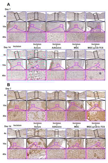 (A) Performed M1-specific anti-iNOS antibody and (B) M2-specific anti-mannose receptor antibody immunostained images of untreated incision, and incisions treated with suture (incision + suture), cyanoacrylate (incision + adhesive), MGC (incision + MGC), and MGC-g-CD-ic-TCS (incision + MGC-g-CD-ic-TCS) after 7 and 14 days. The slides were observed at 4× (200 µm), 10× (100 µm) and 40× (20 µm), respectively. At 4× images, the black rectangle boxes indicate incised part. At 10× images, the pink rectangle boxes indicate M1-specific anti-iNOS antibody and M2-specific anti-mannose receptor antibody immunostained images.