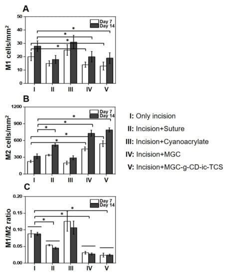 (A) M1, (B) M2, and (C) M1/M2 ratio of untreated incision, and incisions treated with suture (incision + suture), cyanoacrylate (incision + adhesive), MGC (incision + MGC), and MGC-g-CD-ic-TCS (incision + MGC-g-CD-ic-TCS) after 7 and 14 days (n = 3, * p < 0.05).