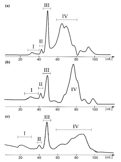 The Bio-Gel P-30 elution profiles of hydrolysed supernatants obtained after ultracentrifugation of S. sonnei phase II (a), E. coli R1 (b), and E. coli K12 (c) lipopolysaccharides (LPS). Fractions I, II, III, and IV were collected and further analyzed by mass spectrometry.