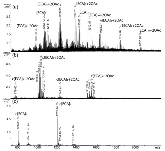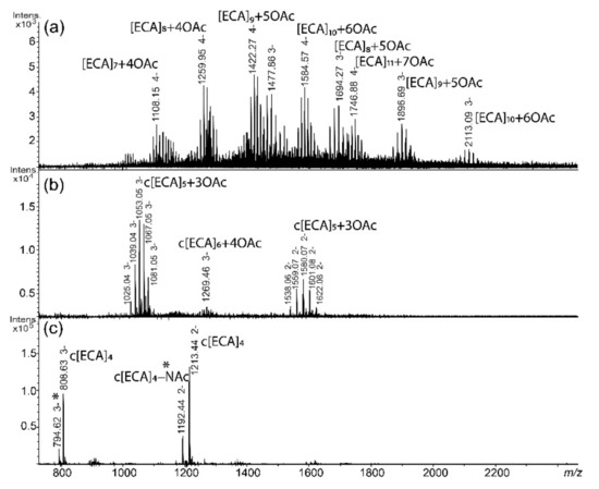 The fraction I was characterized by the presence of linear polymers of ECA with characteristic m/z values differences between ions corresponding to OAc (Figure 3a). Linear O-acetylated ECA polysaccharides built from 7 to 10 repeating units were identified in fraction I of E. coli R1; however, lower number of OAc groups were identified for E. coli R1 in comparison with S. sonnei phase II. Fraction II contained in general ECACYC as c[ECA]5 and small amount of c[ECA]6 (Figure 3b), whereas the fraction III consisted of c[ECA]4. The cyclic forms of ECA in E. coli R1 were also substituted with several OAc groups (Figure 3b). An interpretation of ions is shown in Table 2.