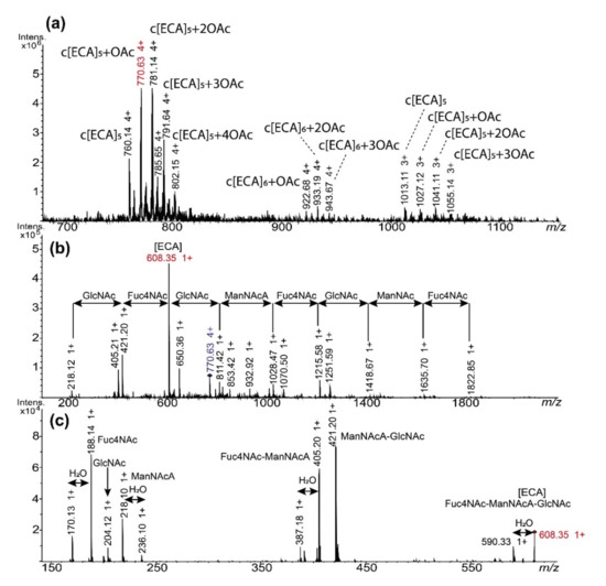 ESI-MSn fragmentation analysis of c[ECA]5 isolated from E. coli R1 LPS supernatant. Spectra were acquired in positive-ion mode on ESI-IT mass spectrometer. (a) The MS spectrum of the fraction II; (b) The MS2 of the ion at m/z 770.63 (4+) ion corresponding to the c[ECA]5−OAc; (c) The MS3 of the ion at m/z 608.35 (1+) corresponding to one ECA repeating unit and resulted from the fragmentation of m/z 770.63→608.35. m/z values marked in red correspond to ions selected for MSn fragmentation. GlcNAc, ManNAcA, and Fuc4NAc stand for ECA constituents; H2O stands for mass difference attributed to water molecule.