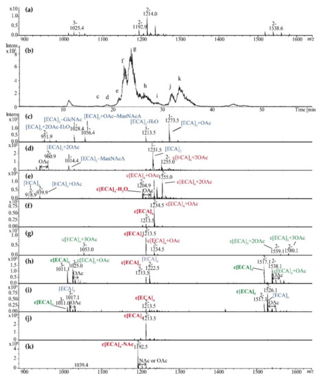 ZIC®HILIC LC-MS separation of E. coli R1 c[ECA]n (pooled fraction II and III isolated by Bio-Gel P-30 fractionation). (a) Negative ion mode ESI-MS spectrum of fractions II and III (pooled). (b) Base peak chromatogram (BPC) for fractionation in 70–40% gradient of acetonitrile in 0.1% formic acid. (c–k) MS scans corresponding to fractions as it was marked in the panel (b). [ECA], trisaccharide repeating unit of ECA: →3)-α-D-Fucp4NAc-(1→4)-β-D-ManpNAcA-(1→4)-α-D-GlcpNAc-(1→present as constituent of linear [ECA]n or cyclic form of ECA c[ECA]n; OAc or NAc—O- or N-acetyl group; c[ECA]4−NAc stands for c[ECA]4 where one of GlcNAc residues is replaced by GlcN [5,6]. Arabic numerals indicate charge of the ion. Blue, red, and green colors mark linear ECA, c[ECA]4 + nOAc, and c[ECA]5 + nOAc respectively, where non O-acetylated c[ECA]5 and c[ECA]4 is marked by bold green and red font, respectively.