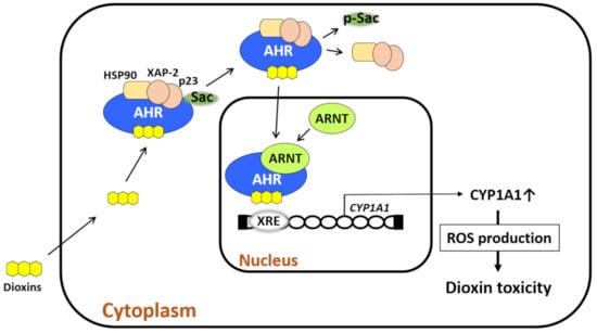Dioxin-mediated activation of aryl hydrocarbon receptor (AHR) induces oxidative stress. AHR resides in the cytoplasm with chaperone proteins (heat shock protein 90 [HSP90], X-associated protein 2 [XAP-2], and p23) and c-Src. Upon ligation by dioxin, AHR leaves this chaperone complex upon c-Src phosphorylation. AHR then translocates from the cytoplasm to the nucleus, in which the dioxin–AHR complex couples with AHR nuclear translocator (ARNT). The dioxin–AHR–ARNT complex binds the xenobiotic response elements (XREs) of target genes such as cytochrome P450 1A1 (CYP1A1), CYP1A2, and CYP1B1. CYP1A1 metabolizes the ligand and induces reactive oxygen species (ROS) generation during the metabolic process. Dioxins are chemically stable and tolerant to CYP1A1 activity, and thus, they induce high levels of ROS production. Dioxin-induced oxidative stress characterizes dioxin-mediated toxicity.