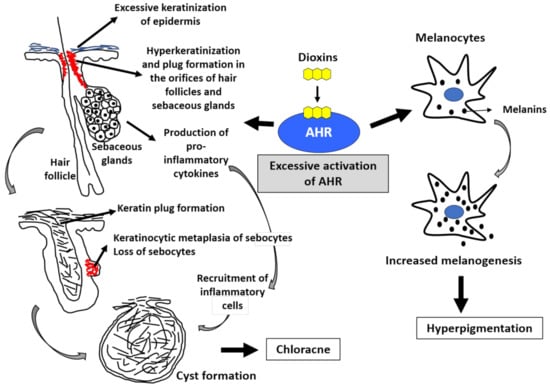 Excessive activation of aryl hydrocarbon receptor (AHR) by dioxins induces chloracne and hyperpigmentation. The activation of AHR induces keratinization (upregulated epidermal differentiation). Excessive activation of AHR by dioxins induces epidermal hyperkeratinization. It also induces hyperkeratinization and keratin plug formation in the orifices of hair follicles and sebaceous glands. Most importantly, excessive AHR activation induces keratinocytic metaplasia of sebocytes, impairs sebum production, and finally results in the loss of sebocytes. Hair follicles eventually form cystic appearance. Activation of AHR by dioxins also induces the production of proinflammatory cytokines and accelerates the recruitment of inflammatory cell infiltration. These epithelial alterations and inflammatory processes lead to the development of chloracne. Melanocytes produce melanins. Excessive AHR activation by dioxins upregulates melanogenesis, and hyperpigmentation occurs.