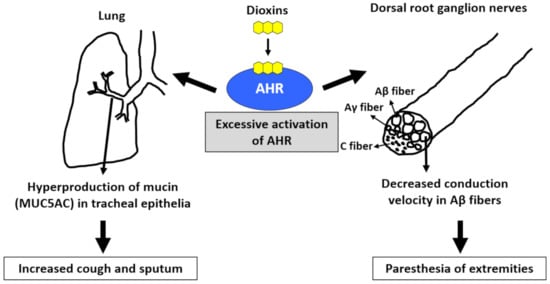 Excessive activation of aryl hydrocarbon receptor (AHR) by dioxins induces cough and sputum as well as paresthesia of the extremities. Activation of AHR increases the production of mucin (MUC5AC) in tracheal epithelial cells, which may cause increased cough and sputum. Activation of AHR ameliorates the conduction velocity of Aβ fibers in the dorsal root ganglion nerves. This may cause paresthesia of the extremities.