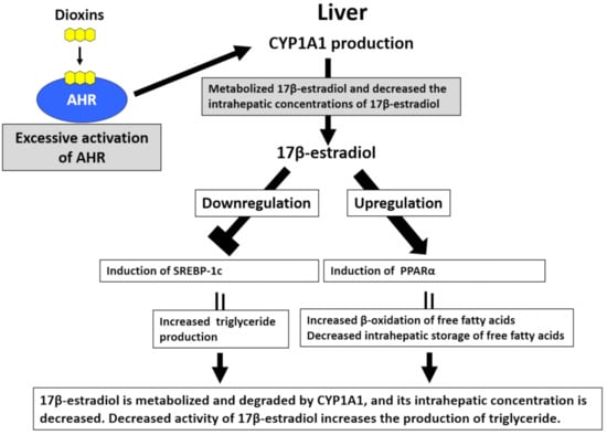 Excessive activation of aryl hydrocarbon receptor (AHR) by dioxins induces hypertriglyceridemia. In hepatocytes, sterol regulatory element-binding protein-1c (SREBP-1c) increases triglyceride production, and peroxisome proliferator-activated receptor-α (PPARα) upregulates the β-oxidation of free fatty acids and reduces the intrahepatic storage of free fatty acids. 17β-estradiol inhibits the activity of SREBP-1c and enhances PPARα activity, subsequently reducing triglyceride production. Hepatocytes abundantly express AHR. Upon the activation of AHR by dioxins, the expression of cytochrome P450 1A1 (CYP1A1) is augmented. CYP1A1 metabolizes 17β-estradiol, thereby decreasing its intrahepatic concentrations and enhancing triglyceride production.