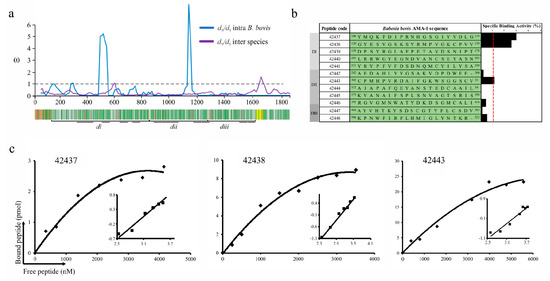 Twelve highly conserved B. bovis AMA-1 20-residue-long regions under negative selection were thus selected to find which of them were involved in bovine erythrocyte binding based on a sensitive and specific binding assay extensively used for detecting protein’s highly conserved functional regions involved in the interaction with P. falciparum, P. vivax and Mycobacterium tuberculosis target cells [5,10,39]. The assays showed conclusively that two B. bovis AMA-1 DI-derived peptides (42437 and 42438) and one from DII (42443) bound specifically to erythrocytes. In addition, peptides 42437 and 42438 displayed low affinity constants, indicating positive cooperativity (Figure 1b,c). No DIII-derived peptide had binding activity consistent with results for P. vivax (PvAMA-1) and Plasmodium yoelii AMA-1 (PyAMA-1), given that such regions do not take place in erythrocyte binding [10,40]. It has been shown that Abs directed against some peptides located in B. bovis AMA-1 DI (46FAFHREPTNRRLTRRA60) and DII (395RGVGMNWATYDKDSG409 and 453YVEPRAKTTNKYLDV467) were able to reduce invasion by 65% [27]. DII-derived 395R-G409 did not interact with bovine erythrocytes whilst 46F-A60 and 453Y-V467 peptides were not considered for peptide-cell interaction assays given their polymorphic nature (Figure 1b). Due to the above and given that a suitable vaccine candidate must be involved in protein-receptor interaction and avoid an allele-specific immune response [41], it could be suggested that peptides 42437, 42438, and 42443 are promising candidates for evaluating their usefulness as synthetic vaccine components.