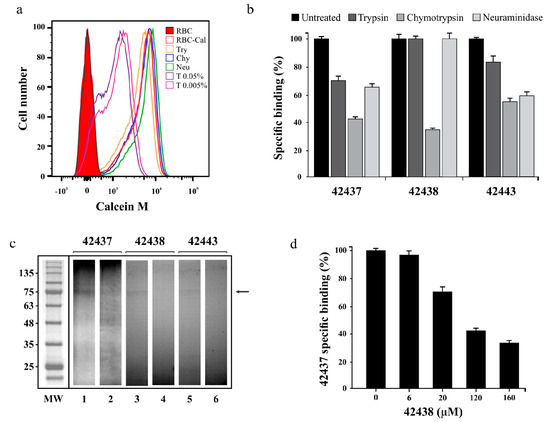 Peptides’ specific binding activity. (a) Cell viability assay showing Calcein M signal (x-axis) and the amount of cells (y-axis). Bovine RBC treated with trypsin (Try) chymotrypsin (Chy), neuraminidase (Neu), Triton X-100 (T) or dyed with Calcein M (RBC-Cal) are also shown. (b) Specific binding effect of enzyme treatment on B. bovis AMA-1 42437, 42438 and 42443 peptides. The specific enzyme-treated erythrocyte binding percentage is represented by a bar. Untreated RBC were used as control. (c) Cross-linking assay. The autoradiogram shows radiolabelled HABPs’ total (odd lane) and inhibited (even lane) binding to erythrocytes using non-radiolabelled peptides. The molecular weight (MW) pattern and receptor (arrow) found are also shown. (d) Peptide 43437 binding competition assay, using different non-radiolabelled peptide 42443 concentrations. The 42443 binding percentage and μM concentration are shown. Standard deviations for Figure 2b,d were below 5%.