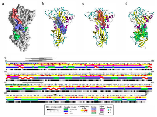 The ectodomain was structurally modelled to analyse each peptide’s spatial location since it was found that B. bovis AMA-1 had HABPs to target cells. The methodology enabled obtaining very good quality 3D models (Figure S3a); four missing loops in the B. divergens structure were modelled ab-initio to complete the B. bovis AMA-1 homology model (Figure S3b). It was observed that peptides 42437 and 42438 had more significantly surface-exposed sectors than 42443 when B. bovis AMA-1 HABPs were located on 3D structure (Figure 3a–d), supported by solvent accessibility analysis (Figure 3e). This finding agreed with the highest binding activity and affinity found for peptides 42437 and 42438 (Figure 1b,c), indicating that they could be involved in target cell receptor binding.