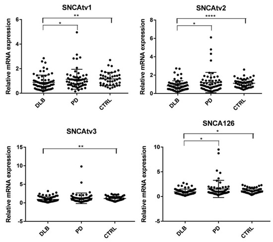 The expression of only four of the five SNCA transcripts could be determined in blood. SNCA112 had the lowest expression, and the construction of a valid standard curve failed. Figure 2 shows that compared to controls, the expression of all four SNCA transcripts was significantly diminished in DLB, and remained unchanged in PD. Down-regulation of SNCAtv1, SNCAtv2, and SNCA126 was also significant when compared with PD (Figure 2).