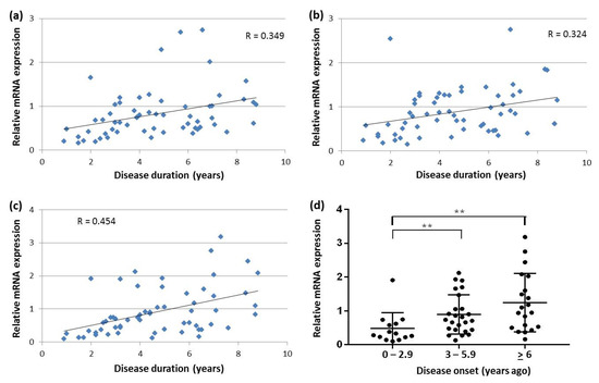 2.7. Correlation between SNCA Transcript Expression, Disease Duration and Age-at-Onset in Blood