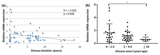 SNCAtv3 expression in blood of PD patients: (a) correlation between SNCAtv3 expression and disease duration; (b) comparison of SNCAtv3 expression levels in three PD groups with different disease duration. * p < 0.05.