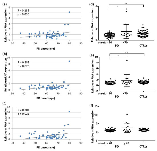 Correlation between the age of PD onset and (a) SNCAtv1, (b) SNCAtv2, and (c) SNCAtv3 expression. SNCA expression in two age-at-onset dependent subgroups compared to controls: (d) SNCAtv1; (e) SNCAtv2; (f) SNCAtv3. * p <0.05, ** p < 0.01.