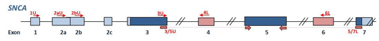 Schematic representation of the SNCA gene showing the localization of the primers listed in Table 6. Arrows represent the location of the primers.