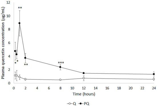 Evolution of the plasma concentration of quercetin after intraperitoneal administration of a single bolus of equimolar P-quercetin and natural quercetin. Values are expressed as the mean ± standard error of the mean (SEM) (n = 5 per group). * p < 0.05; ** p < 0.01; *** p < 0.001 vs. Q group. Q: quercetin (50 mg/kg, i.p.); PQ: 100 mg/kg i.p. P-quercetin (containing 50 mg/kg quercetin).