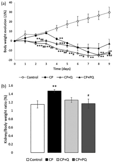 Evolution of general health status. (a) Percentage variation in body weight through the experiment; (b) Kidney/body weight ratio at day 9. Values are expressed as the mean ± SEM (n = 3–5 per group). * p < 0.05; ** p < 0.01; *** p < 0.001 vs. Control group. # p < 0.05; ## p < 0.01 vs. CP group. CP: cisplatin (6.5 mg/kg, i.p.) on day 3; CP + Q: quercetin (50 mg/kg, i.p.) for 9 days and cisplatin (6.5 mg/kg, i.p.) on day 3; CP + PQ: P-quercetin (100 mg/kg, i.p.) for 9 days and cisplatin (6.5 mg/kg, i.p.) on day 3.