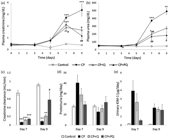 Evolution of renal parameters. (a) Plasma creatinine concentration; (b) Plasma urea concentration; (c) Creatinine clearance; (d) Proteinuria; and (e) KIM-1 urinary excretion. Values are expressed as the mean ± SEM (n = 3–5 per group). * p < 0.05; ** p < 0.01; *** p < 0.001 vs. Control group. # p < 0.05; ## p < 0.01 vs. CP group. CP: cisplatin (6.5 mg/kg, i.p.) on day 3; CP + Q: quercetin (50 mg/kg, i.p.) for 9 days and cisplatin (6.5 mg/kg, i.p.) on day 3; CP + PQ: P-quercetin (100 mg/kg, i.p.) for 9 days and cisplatin (6.5 mg/kg, i.p.) on day 3. KIM-1: kidney injury molecule 1.