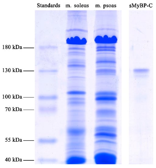 SDS-PAGE of purified sMyBP-C (right-hand lane). Rabbit skeletal muscles m. soleus and m. psoas were used as controls. Protein markers of molecular weights within the range of 15–180 kDa were also used (left-hand lane). The original images are at: https://drive.google.com/file/d/1THBQ23ezEtVeIx3_WKw6Py2Ql0ixHUVH/view?usp=sharing.