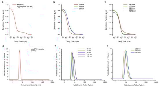 Kinetics of sMyBP-C aggregation monitored by DLS. (a–c) Evolution of field autocorrelation functions g1(t) of light scattered during sMyBP-C aggregate formation (pH 7.0–7.5, 10 °C). (d–f) Distribution of sMyBP-C particles. Formation of large aggregates and their time-dependent growth are shown.
