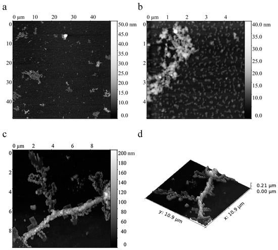 AFM of sMyBP-C incubated for 24 h in a solution containing 0.15 M glycine-KOH, pH 7.0, revealed aggregates of different morphology and size. Large amorphous structures up to 4 µm long and ~7–15 nm high were observed (Figure 5a,b). Large extended structures ~100 nm high and ~100 nm wide also occurred (Figure 5c,d). Short extended and spherical aggregates were also seen (Figure 5b–d). Small spherical structures ~50 nm in diameter and ~10 nm high were, apparently, protein oligomers. Short extended structures up to 200 nm long, ~50–60 nm wide, and 4–6 nm high were also found (Figure 5b, Supplementary Figure S3). Possibly, these structures are short protofibrils or a group of oligomers at a close distance one from another. The latter assumption is the most preferable as DLS revealed no particles of size corresponding to that of protofibrils. Interestingly, extended aggregates and spherical small structures were of the same height, and in most cases, the diameter of these spherical aggregates coincided with the width of extended structures (Figure 5b).