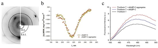 X-ray diffraction analysis of sMyBP-C aggregates revealed two ring-shaped diffuse reflections at 4.6 and 10 Å (Figure 6a), corresponding to the quaternary cross-β structure characteristic of all amyloid fibrils. Diffuse rings on the diffraction pattern have been explained and described [] in studies of non-oriented and weakly oriented amyloid samples. Similar diffuse ring reflections have been shown for amyloid aggregates of many proteins [,,,,,,,,,,,,].