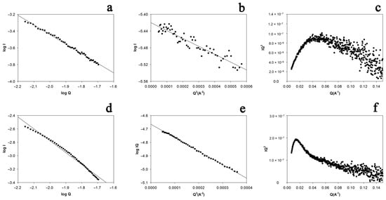 SAXS was measured as in []. The distance between the sample and the source was 2.35 m. The range of detectable scattering vectors Q was 0.0080.2 Å−1 (Q = 4 π sinθ/λ, where λ is the wavelength of X-rays, 2θ is the scattering angle). The data were registered with a PILATUS 100 K two-dimensional CCD X-ray detector. The shape of particles was estimated from the slope (tanα) of log I dependence on log Q, where I is the intensity of scattering, and Q is the scattering vector [].