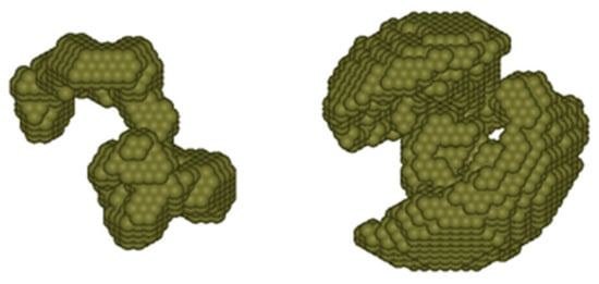 The protein conformation can be assessed from SAXS data using the DAMMIF program []. Figure 8 presents assessed conformations for the molecular form of sMyBP-C (left) and the aggregated form of the protein (right). The aggregated forms are morphologically similar to sMyBP-C oligomers visualized using TEM and AFM (Figure 4 and Figure 5). The conformation of the protein molecule shown in Figure 8 on the left resembles the morphology of cardiac C-protein molecules visualized by electron microscopy and described in [].