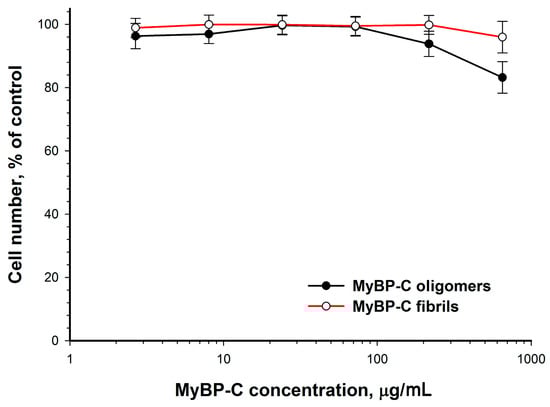 To obtain a high concentration of sMyBP-C, the protein was freeze-dried using a FreeZone 1 Liter Benchtop Freeze Dry System (Labconco, Kansas City, MO, USA). 1% trehalose was used as a stabilizing agent. The quality of sMyBP-C and any degradation after lyophilization were monitored in 7% SDS-PAGE []. To study the cytotoxicity of sMyBP-C aggregation, the protein in a buffer containing 0.3 M KCl, 4.8 mM K2HPO4, 5.2 mM KH2PO4, 0.1 mM DTT, 0.1 mM NaN3, pH 7.0, at an initial concentration of ~5 mg/mL was transferred to a solution of 0.15 M glycine–KOH, pH 7.0. The sample was diluted at 5 °C for 10 min for ionic strength to decrease gradually. Then, to separate oligomers and aggregates, the samples were centrifuged at 15,000 rpm for 10 min. It was assumed that the residue contained mainly aggregates and the supernatant, predominantly oligomers. The oligomers were additionally incubated for the next 24 h for their size to be maximum in the DLS assay.