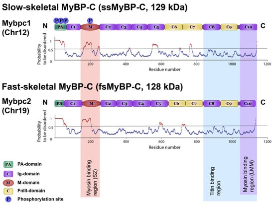 sMyBP-C domain structure schematic aligned with the protein disorder prediction plots by the IsUnstruct program []. Probabilities of ≥0.5 mean a disorder. Upper, ssMyBP-C paralog; lower, fsMyBP-C paralog.