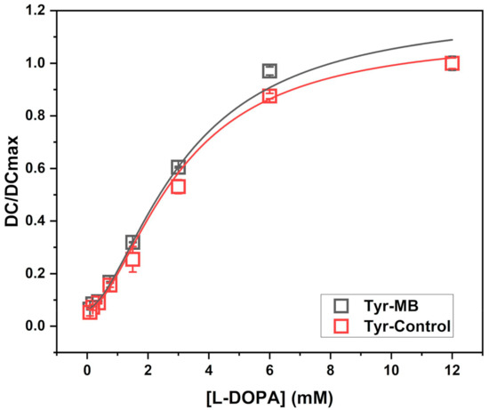 Dopachrome activity of Tyr-MB and Tyr control is described by the dose-response curve. The experimental points were fitted with the Hill equation with the parameters as presented in Table 1 and the caption. For comparison, dopachrome activity, DC, is normalized to the maximum response in dopachrome production, DCmax. Concentrations of L-DOPA substrate ranged with 12, 6, 3, 1.5, 0.75, 0.375, 0.1875, and 0.09375 mM. All measurements were repeated in duplicate and executed independently.