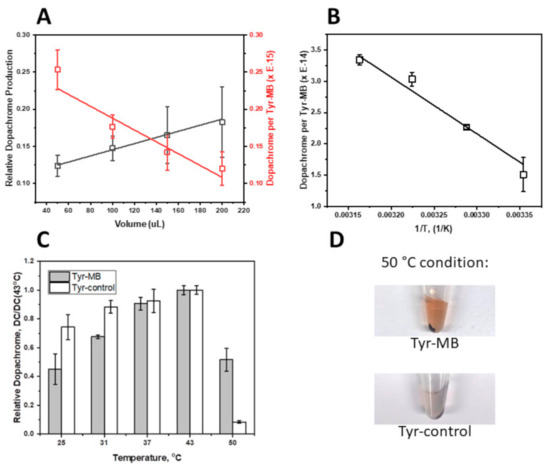 Presented in this work, the volume-dependent, temperature-dependent, and dose-dependent experiments characterize the affinity of Tyr-MB to the L-DOPA substrate. As the volume of MB increased, so did the production of dopachrome, which confirmed that dopachrome production rose with the increasing number of Tyr-MB complexes. Additionally, higher activity of Tyr to L-DOPA substrate was detected as temperature increased (Figure 2B). According to the temperature-dependent behavior, we might expect that binding to MBs increases the protein stability of the Tyr domain, making Tyr functional at even higher temperatures (Figure 2C,D). The increased thermal protein stability in Tyr-MB showed that dopachrome of orange-brown color was produced at even high temperatures (50 °C). In contrast, for native Tyr, no color change was observed at the same temperature condition. Therefore, the native Tyr had little to no catalytic activity and had become unstable due to because of the synthesis of very little or no dopachrome. A different color of dopachrome has been obtained in optimal conditions (37 °C) for native and Tyr-MB. For the Tyr-control, the Tyr is present in solution with dopachrome formation. Therefore, the self-oxidation intensifies the production of a melanin-related product, which causes the solution to be darker and cloudier. Due to melanin-related product formation, there is a higher absorption reading at 475 nm. Finally, the dose-dependent experiment allowed us to explore the similarities between the kinetic parameters of the Tyr-MB complex and the Tyr control shown in Figure 1 with the parameters of the Hill dose-response equation calculated in Table 1.