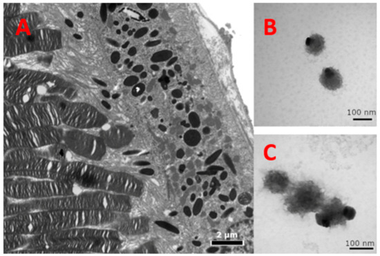 In Figure 4A, the dense regions of the TEM images are the melanocytes in the retinal pigment epithelium (RPE). These darker regions are comparable in color to the darker regions in the melanin-related products of Figure 4B,C. The less dense regions are due to the lack of enzymes and scaffolding that are usually present in a cell. The TEM images of the melanin-related product revealed single spherical-shaped and polymerized melanin with an average diameter of 121.4 ± 18.1 nm in Figure 4B,C.