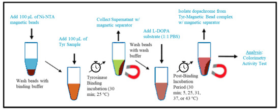 The experimental setup included four Eppendorf tubes for each trial. Tube 1 contained 100 µL of the MB, which were first washed (500 µL of binding buffer) and resuspended with 100 µL of the binding buffer (20 mM Tris-HCl, pH 8.0, 1 mM imidazole, 0.5 M NaCl). Tube 2 was labeled for the supernatant after the Tyr binding incubation period (TBI). Tube 3 and 4 were labeled as “wash 1” and “wash 2” and were for collection after wash buffer was added to verify Tyr was bound to the magnetic beads. Tube 5 was for the positive control (Tyr) and Tube 6 contained the negative control (1× PBS). After adding 100 µL of the binding buffer to tube 1 (containing MB), 100 µL of Tyr (1:1 ratio) was added to the suspension. Tubes 1, 5, and 6 were immediately placed on an end-to-end rotator (Benchmark Scientific, Sayreville, NJ, USA) at 25 °C for 30 min. The technique for binding Tyr to MB were repeated in triplicate and were executed independently for each temperature condition (5, 25, 31, 37, and 43 °C in the temperature-dependent experiment) or volume of MB condition (50, 100, 150, and 200 µL).