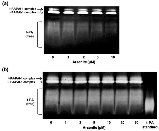 - Jiang, S.J.; Lin, T.M.; Wu, H.L.; Han, H.S.; Shi, G.Y. Decrease of fibrinolytic activity in human endothelial cells by arsenite. Thromb. Res. 2002, 105, 55–62. [Google Scholar] [CrossRef]