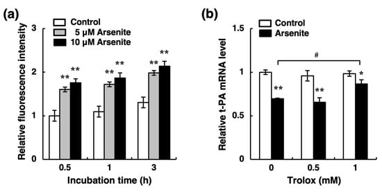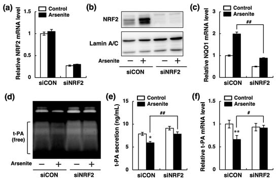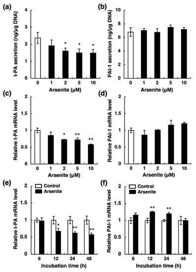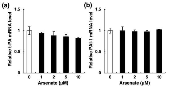 Nakano, T.; Takahashi, T.; Yamamoto, C.; Yoshida, E.; Kaji, T.; Fujiwara, Y. Arsenite Inhibits Tissue-Type Plasminogen Activator Synthesis through NRF2 Activation in Cultured Human Vascular Endothelial EA.hy926 Cells. Int. J. Mol. Sci. 2021, 22, 739. https://doi.org/10.3390/ijms22020739