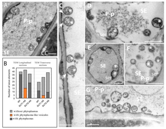 - Musetti, R.; Pagliari, L.; Buxa, S.V.; Degola, F.; De Marco, F.; Loschi, A.; Kogel, K.-H.; Van Bel, A.J.E. OHMS**: Phytoplasmas dictate changes in sieve-element ultrastructure to accommodate their requirements for nutrition, multiplication and translocation. Plant Signal. Behav. 2016, 11, e1138191. [Google Scholar] [CrossRef] [PubMed][Green Version]